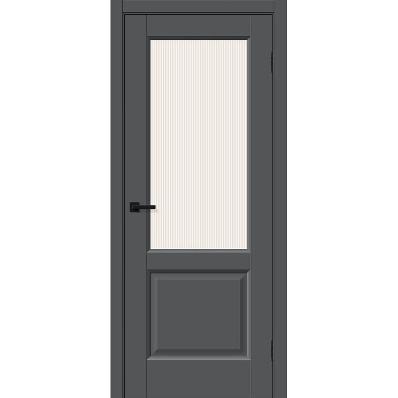 Межкомнатная остекленная дверь рамочной конструкции с объемной филенкой. Особенности: Композитный каркас двери со стабилизирующим слоем LVL или соснового бруса облицован плитами высокой плотности, без пустот. Дверь проклеена в местах соединения деталей, что обеспечивает долгий срок службы. Бескромочная технология производства, торцы защищены по технологии «2-Edge». Для отделки всех лицевых поверхностей применяется влагостойкий PUR-клей необратимой полимеризации. Крепеж из закаленной стали надежно фиксирует детали двери в 10 точках (в обычных дверях не более 6). Отделка: ПЭТ - инновационное покрытие c гладкой и приятной на ощупь поверхностью, устойчиво к повреждениям, не выцветает со временем. «Эмаль-эффект» - как эмаль, только лучше. Один из самых экологичных материалов (институт Fraunhofer IVV, Германия). Компания Bravo первой в России начала использовать 100% ПЭТ (без добавок) для промышленного производства дверей. Декор: Stormy Silk - примерно соответствует RAL 7016, матовый (≈ 3,8 GU). Стекло: Magic Moru - белое рифленое сатинированное. Дешевое стекло с пескоструйной обработкой не используем. Комплектующие: Телескопические погонажные изделия для качественного регулируемого монтажа. Дверная коробка с TPE-уплотнителем для мягкого закрывания. Толщина, мм: 36 Масса брутто, кг: 26.7 Объем, куб.м: 0.064